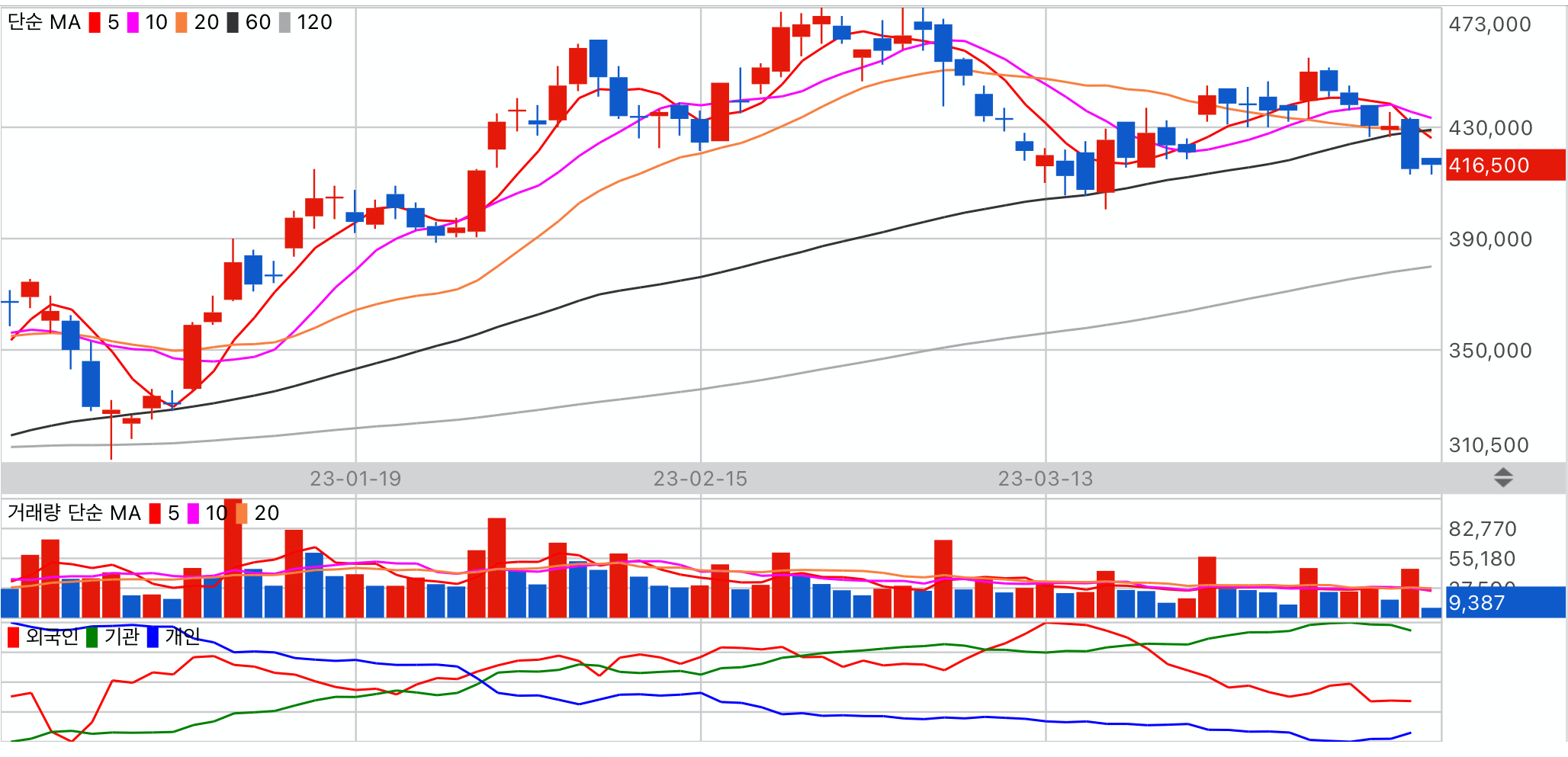 이에 하나증권은 투자의견 ‘매수’를 유지하고, 목표주가는 44만원에서 53만원으로 상향 조정했습니다. 4월 6일 종가는 41만5000원입니다.