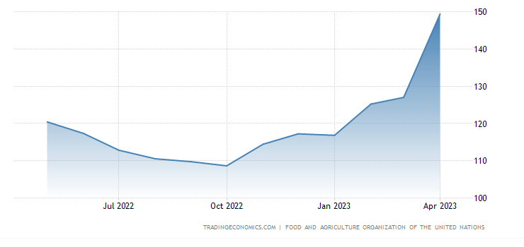 세계식량가격지수는 지난해 3월 159.7로 최고치를 기록한 이후 12개월째 하락세를 보였으나 지난달 다시 상승했습니다.