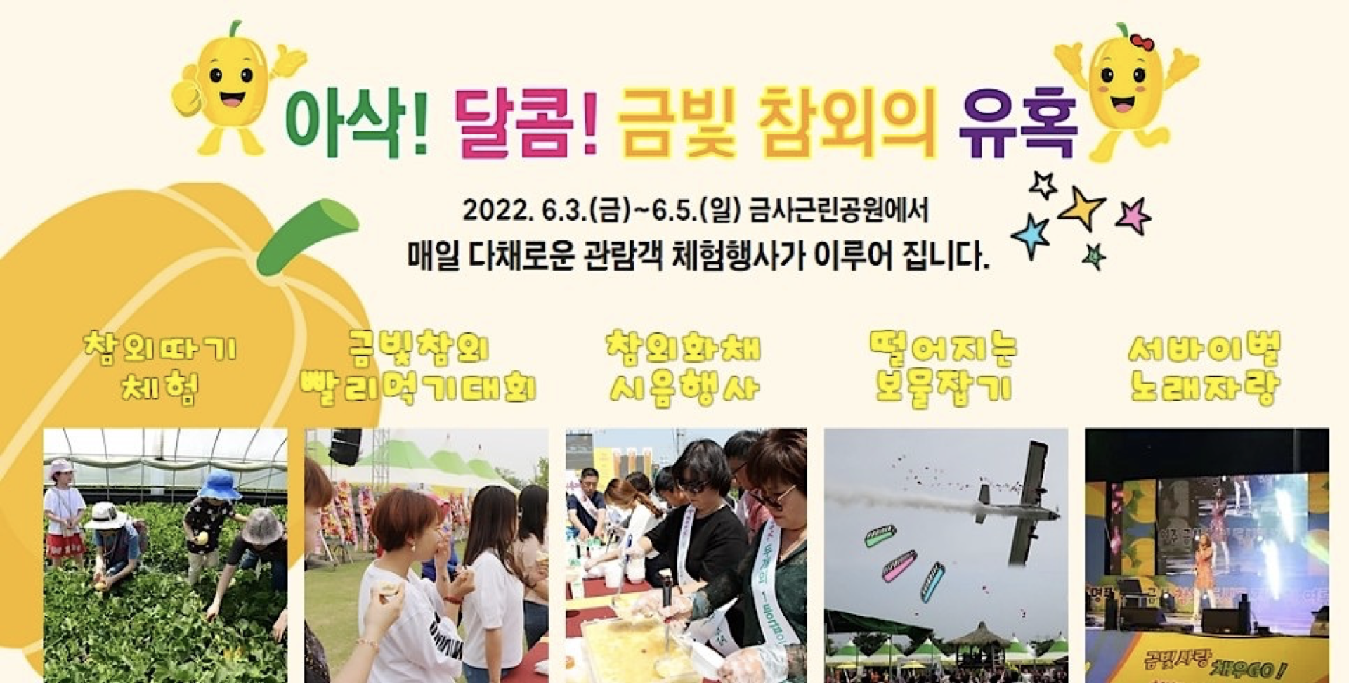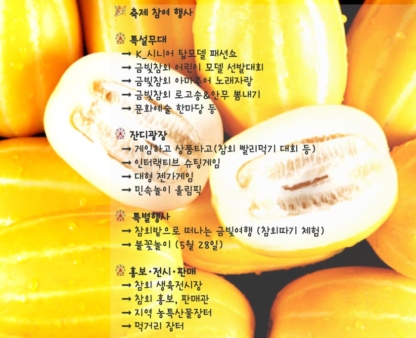🔹 체험행사 : 민속놀이체험장, 참외 화채 무료 시음회, 행복 탑 쌓기, 참외 보물찾기, 참외밭으로 금빛여행 서바이벌 노래자랑 등