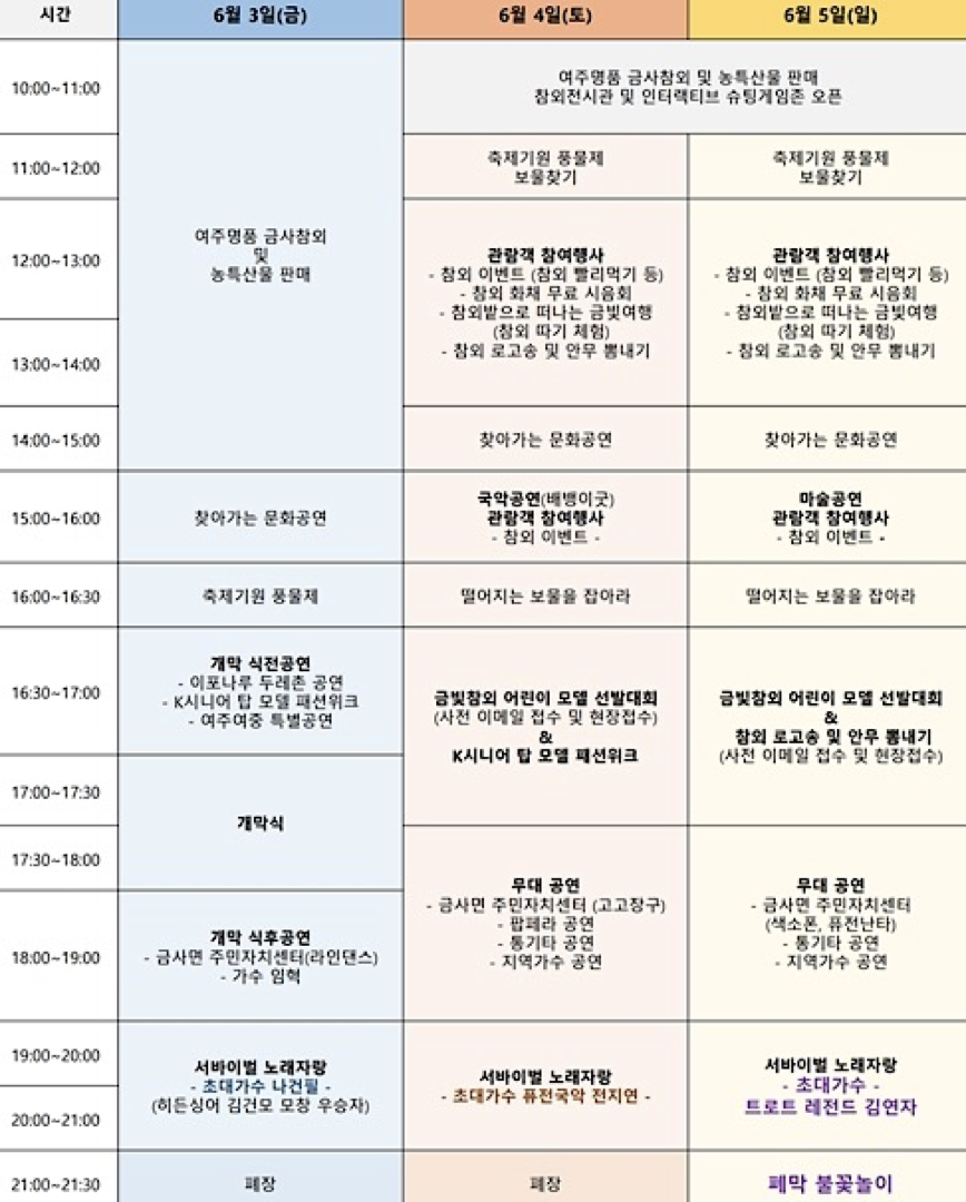 그러면, 여주 금사참외 축제의 자세한 행사와 라인업, 프로그램, 체험행사에 대해서 알아볼까요.