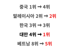 반도체 시장 점유율 또한 전망이 밝지만은 않습니다. 미중 갈등으로 중국에 대한 수출이 급감하는 와중에 미국에 대한 수출이 반사이익을 얻었다고 볼 수 없는 상황입니다. 미중 갈등으로 수혜를 본 나라는 대만과 베트남으로 반도체 미국시장 점유율이 19.2(기존 9.5%), 9.8%(기존 2.5%) 상승했습니다. 한국은 점유율이 10.8%에서 12.6로 1.8% 약간 상승하는데 그쳤습니다. (출처 : 사이트)