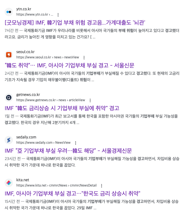 IMF, 한국 가계부채 위험 경고에 이어 기업부채 경고