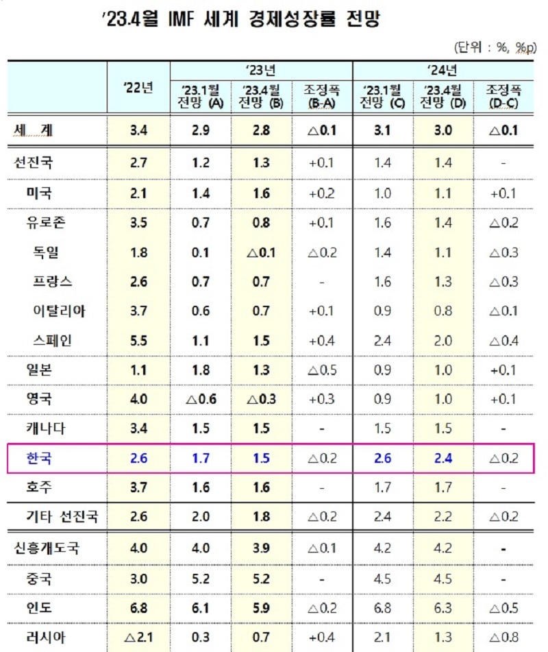 또, 주요국가의 경제성장율 전망치가 한국은 종전 1.7%에서 1.5%로 0.2%포인트 하향 조정되었습니다.