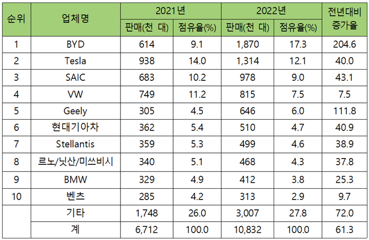 그럼에도 불구하고 세 배 정도 판매량이 급증한 BYD와 역시 40.0% 증가하여 사상 처음 100만대를 돌파하여 약 131만4천여대를 판매한 테슬라 등의 영향으로 전세계 점유율은 2021년 5.4%에서 2022년 4.6%로 소폭 하락하였습니다.
