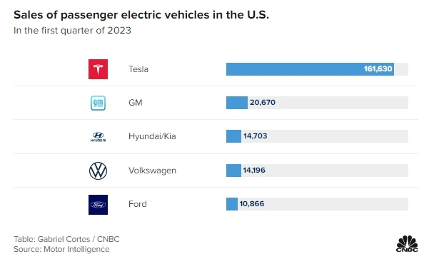 2023년 1분기 주요 메이커별 전기차 판매량은 테슬라가 16만1630대, GM이 2만670대에 이어 현대기아차가 1만4703대로 3위, 이어서 폭스바겐이 1만4196대 그리고 포드가 1만866대로서 압도적 1위 테슬라를 제외하고는 2위부터 5위까지 판매 대수가 별로 차이가 나지 않는 극심한 경쟁 상황입니다.