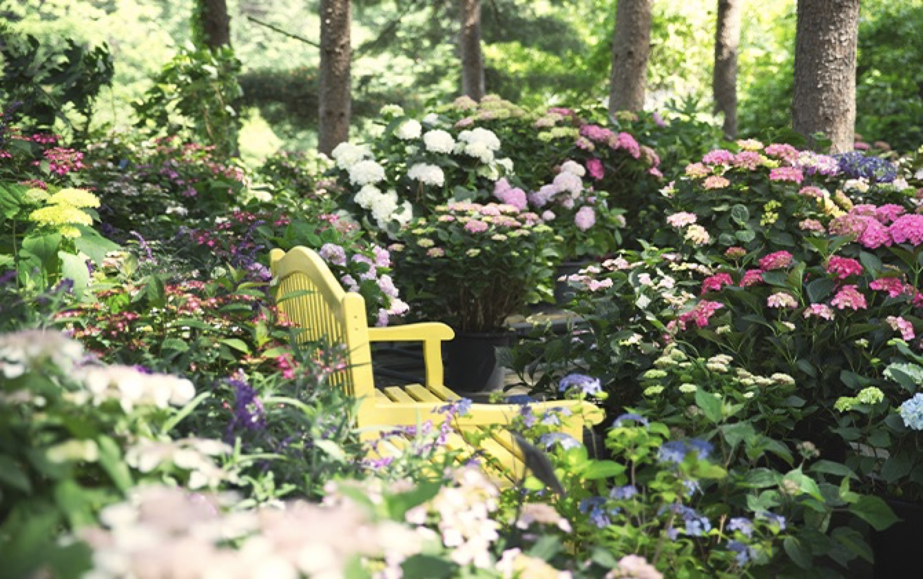 수국들에 둘러싸인 벤치에서의 마음이 가벼워지는 숨쉬기