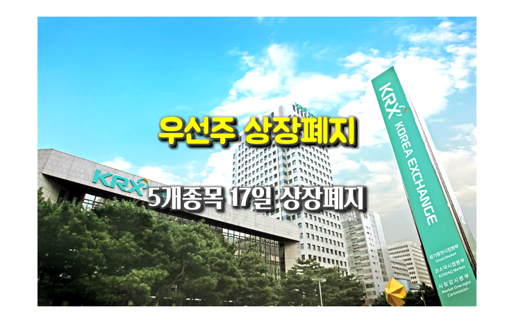 4일 한국거래소에 따르면 한국거래소 유가증권시장본부는 삼성중공업1우선주, SK네트웍스1우선주, DB하이텍1우선주, 현대비앤지스틸1우선주, 흥국화재해상보험2우선주 등 5개 종목을 상장폐지합니다.