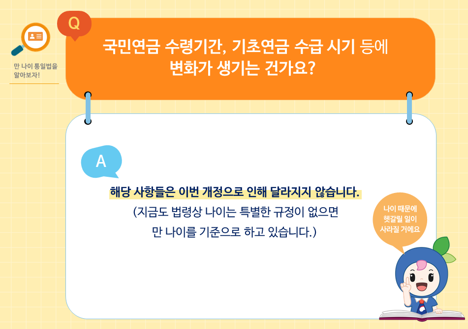 한편 이번 만 나이 통일법으로 인해 연금 수급 시기나 정년 등이 달라지는가에 대한 문의가 있는데, 한 마디로 ‘달라지는 것’은 없습니다.