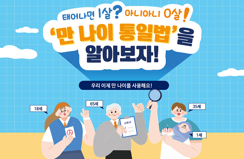 ‘만 나이 통일법’이 6월 28일부터 적용됩니다. 법령 등에 특별한 규정이 있는 경우를 제외하고는 만 나이로 계산하게 됩니다. 이에 따라 법령·계약·공문서 등에 표시된 나이는 ‘만’이라고 표시하지 않아도 ‘만 나이’를 뜻하게 됩니다. 정부는 만 나이 통일법 시행으로 나이 기준의 혼용으로 발생했던 각종 분쟁, 민원이 크게 해소될 수 있을 것으로 기대하고 있습니다.