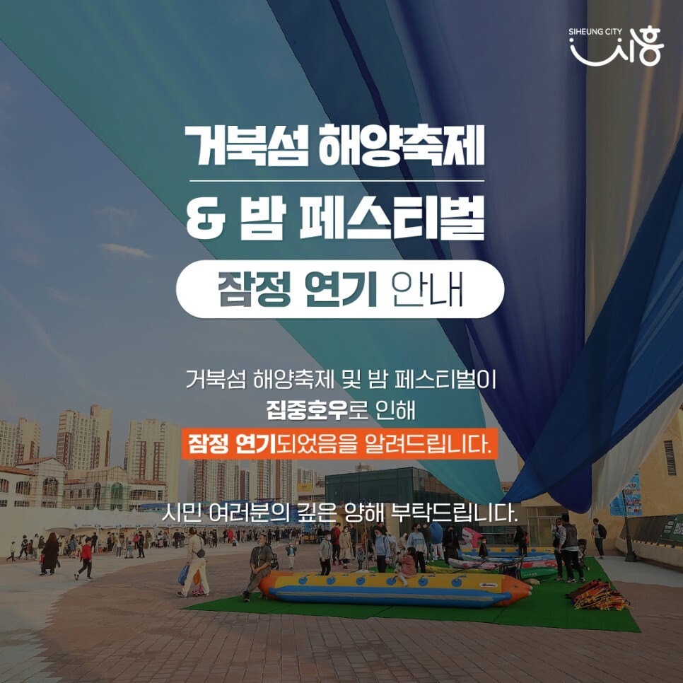 시흥시에서는 7월 18일 '시흥 거북섬 해양축제 거북섬 밤 페스티벌' 잠정 연기한다고 발표하였습니다.