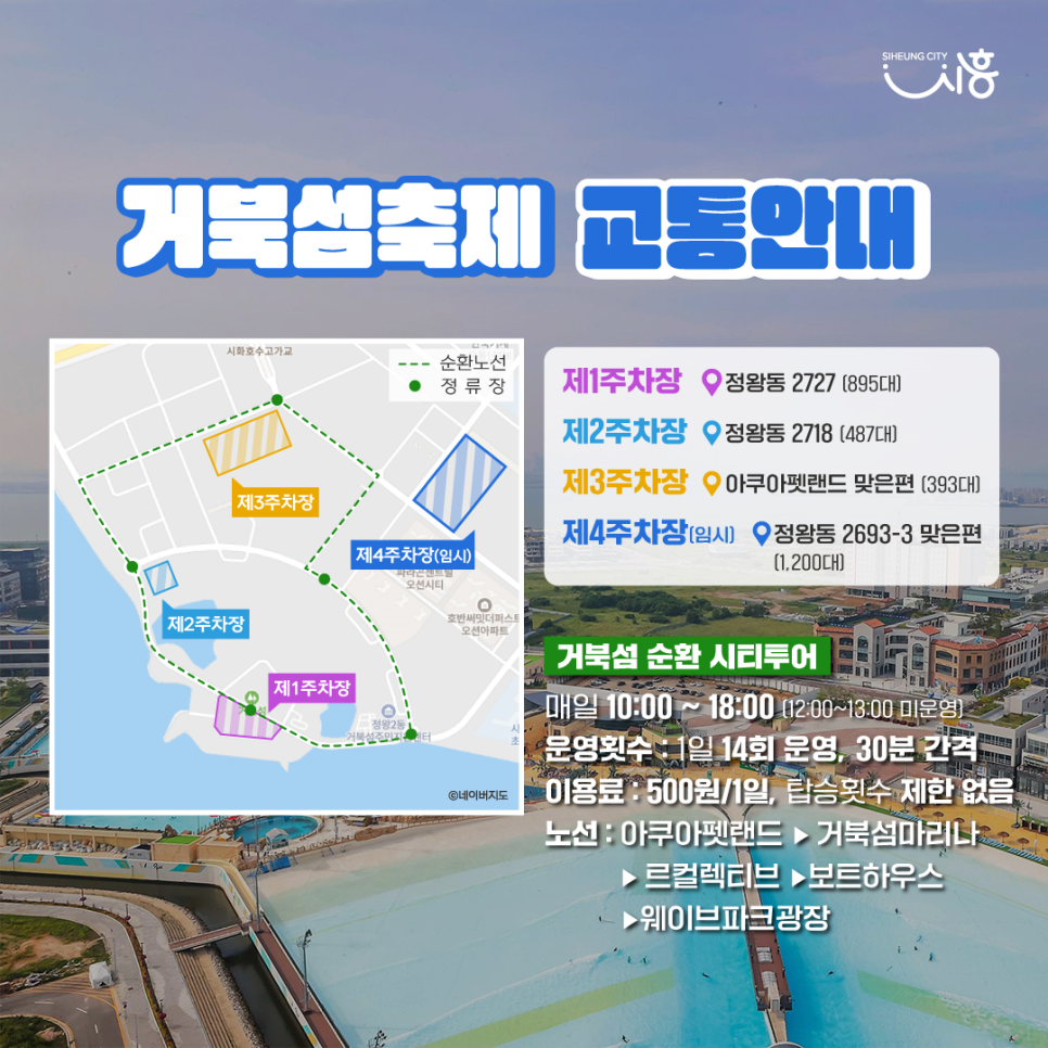 또, 지난 1일부터 운영 중인 거북섬 순환 시티투어버스(일일 이용료 500원)를 타면, 주차장에서 축제장까지 이동하면서 거북섬 해양단지 인프라를 함께 관광할 수 있어 더욱 편리합니다.