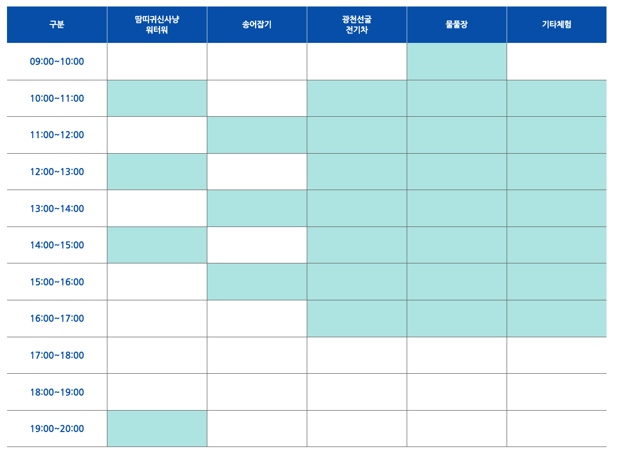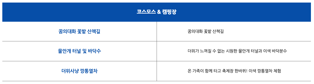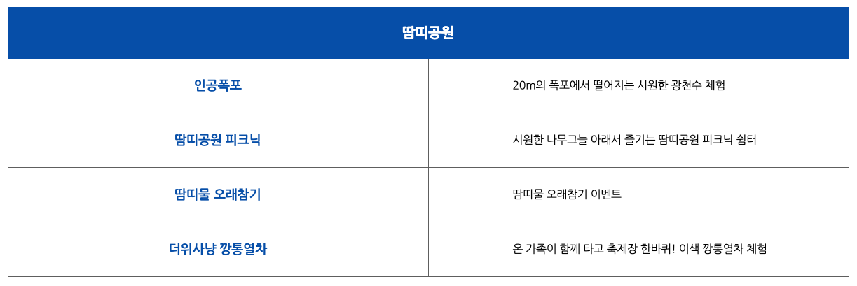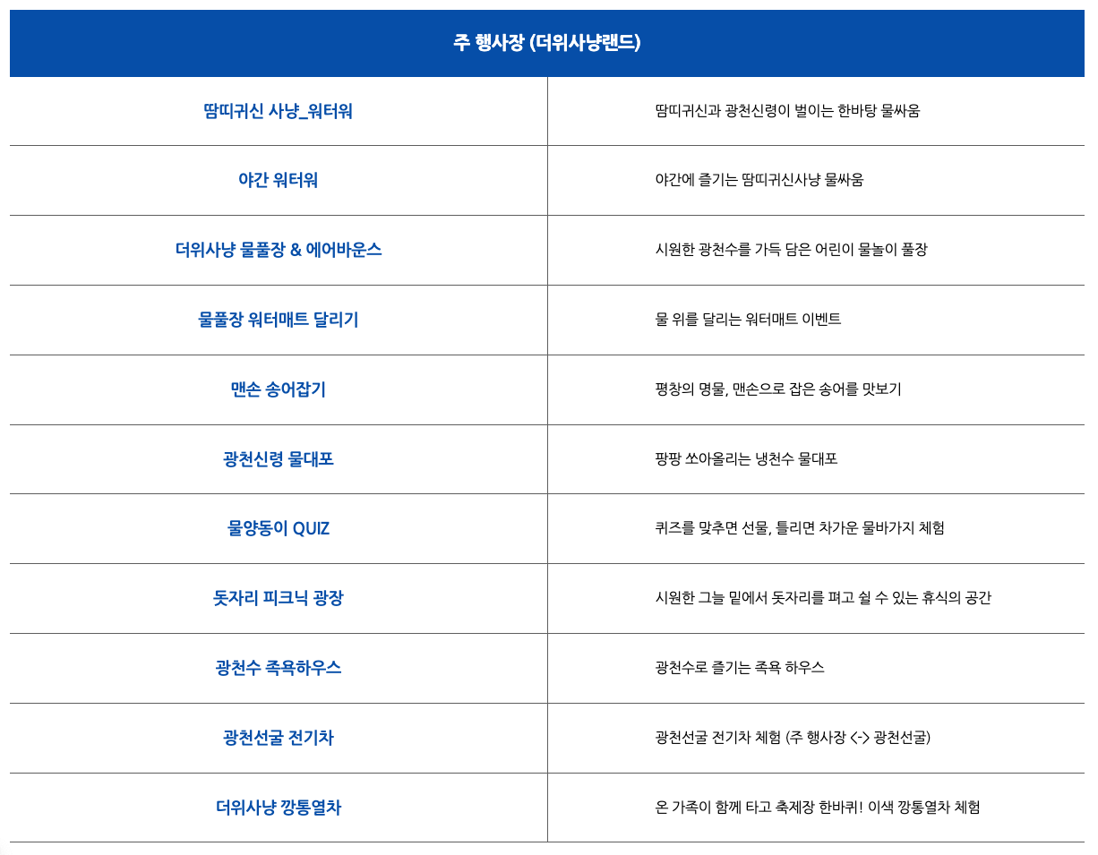 2. 부대프로그램 : 더위사냥 물풀장, 맨손 송어잡기 체험, 냉천수 물대포, 물양동이 이벤트, 광천선굴 전기차 투어, 깡통열차 체험
