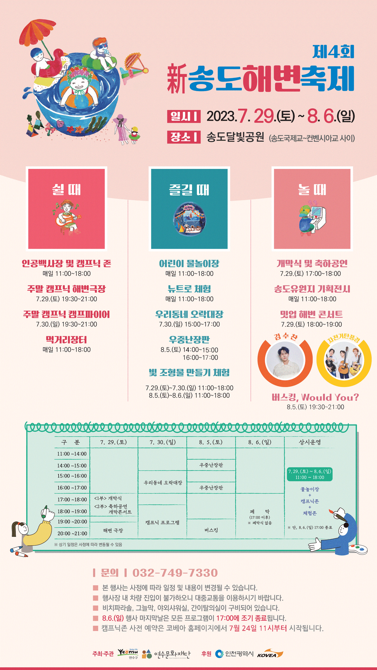 5년만에 돌아온 '제4회 新송도해변축제' 는 연수구의 대표축제로써 송도의 아름다운 도시경관과 함께 물놀이를 즐기며 온가족이 여름을 즐겁게 보낼 수 있는 축제이다.