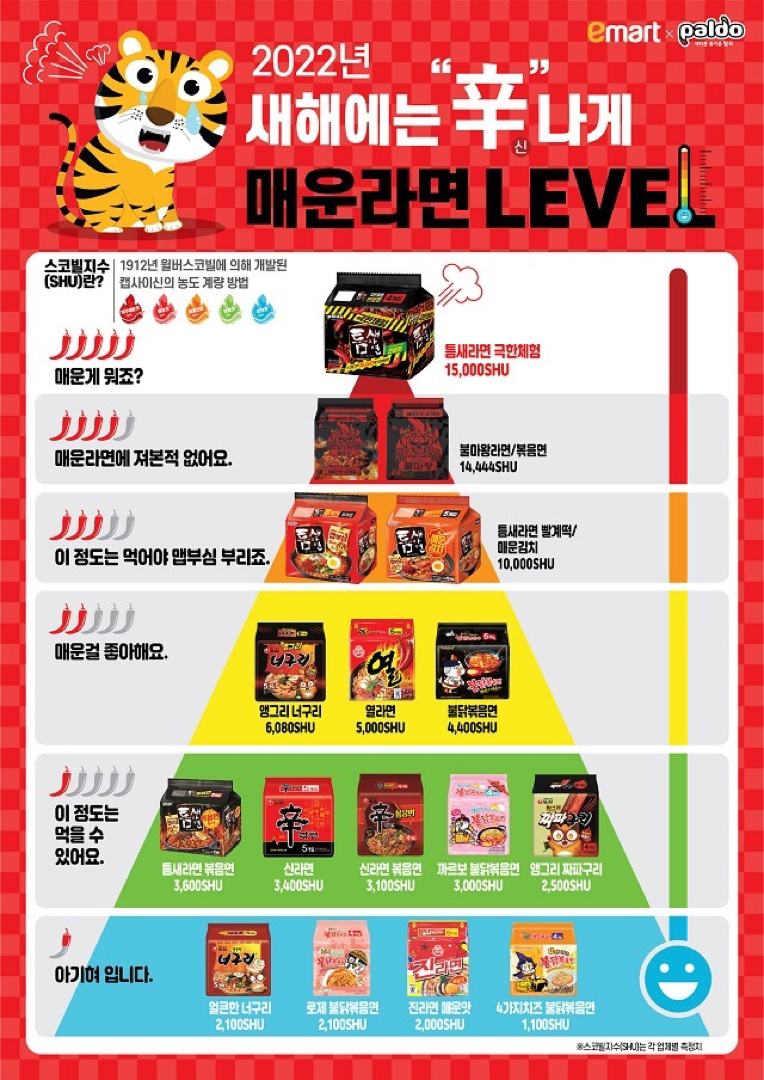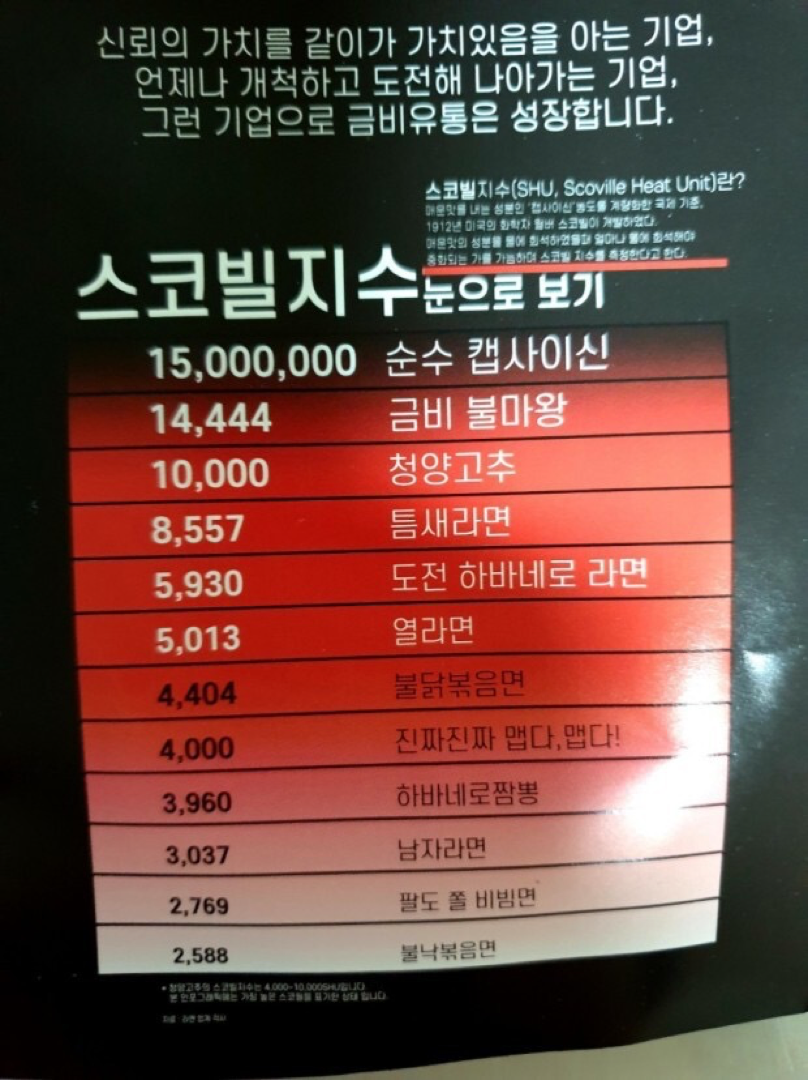또, 스코빌 지수로 비교될 수 있는 매운 라면도 확인해 보고 실제 대표적인 매운 맛 지표도 알아보겠습니다.