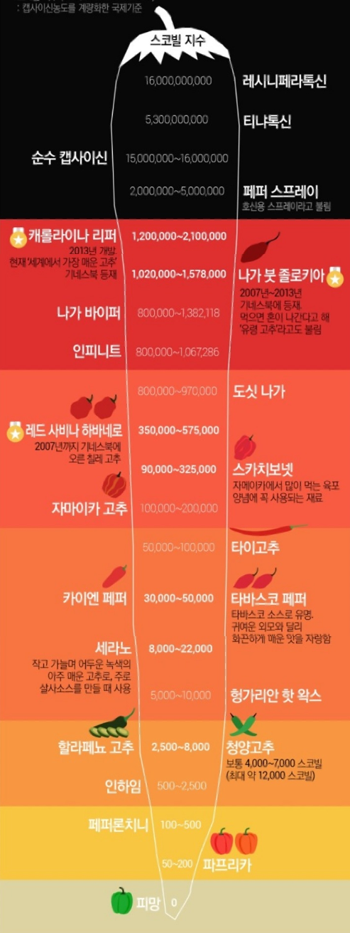 스코빌 척도에서는 SHU라는 단위가 쓰이는데 전혀 안 매운 0에서 시작해서 매워질수록 수치가 계속 높아집니다. 다만 매운맛의 원인 물질인 순수 캡사이신 자체의 스코빌 수치는 약 1,500만에서 1,600만이라고 합니다