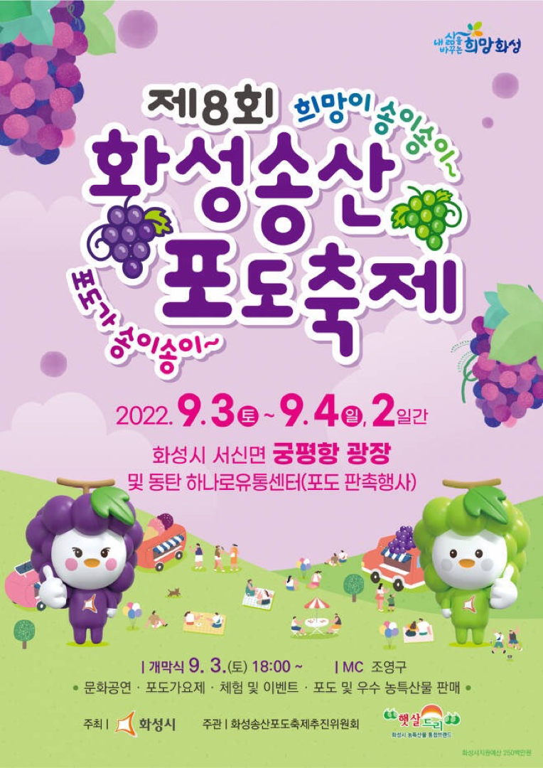 화성시가 내달 2일부터 3일까지 서신면 궁평항에서 ‘제9회 화성송산포도축제’를 개최합니다. 같은 기간 동안 소비자들이 쉽게 포도를 구매할 수 있도록 동탄호수공원 수변문화광장에서 포도 판촉행사도 준비되어 있습니다.
