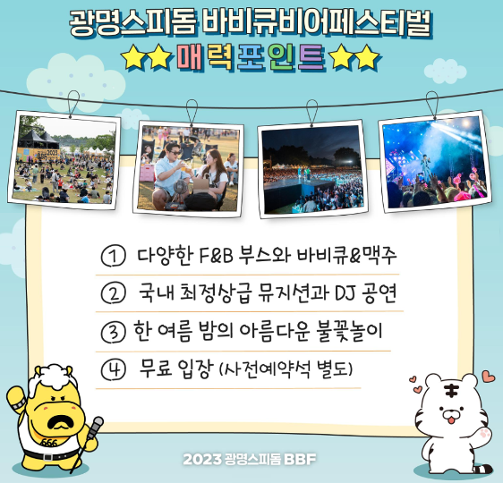 2023년 광명 스피돔에서 진행되는 대규모 문화공연과 맥주 및 각종 F&B, BBQ까지 만나볼 수 있는 바비큐비어페스티벌입니다.