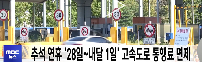 이에 따라 9월 28일 0시부터 10월 1일 24시까지 고속도로를 이용하는 차량은 통행료를 면제받게 되며,