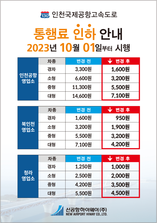 그리고 인천공항을 이용하시는 분들의 통행료도 인하된다고 하니 기쁜 소식이 아닐 수 없습니다.