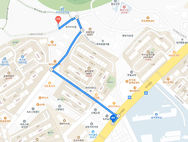 영랑호나 청초호에서 오시기에는 삥~~ 둘러서 속초교동 스타벅스를 지나 GS프레시를 돌아서 오시거나