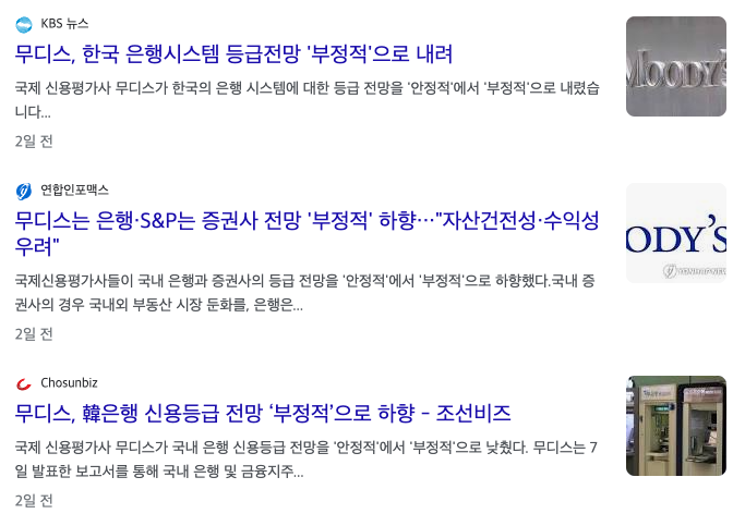 #글로벌신용평가사 #무디스 #SnP글로벌 #미래에셋증권 #한국투자증권 #익스포저 #한국투자금융지주 #부동산리스크 #부동산PF #프로젝트파이낸싱 #자산유동화기업어음 #위험조정자본비율 #유동성악화 #신용등급 #대환대출플랫폼 #인터넷은행점유율확대 #대출경쟁심화 #대출연체율상승 #은행순이자마진축소 #홍콩ELS배상 #주가연계증권배상 #은행사회적책임요구 #실질국내총생산 #GDP성장률 #은행비용수익비율안정적