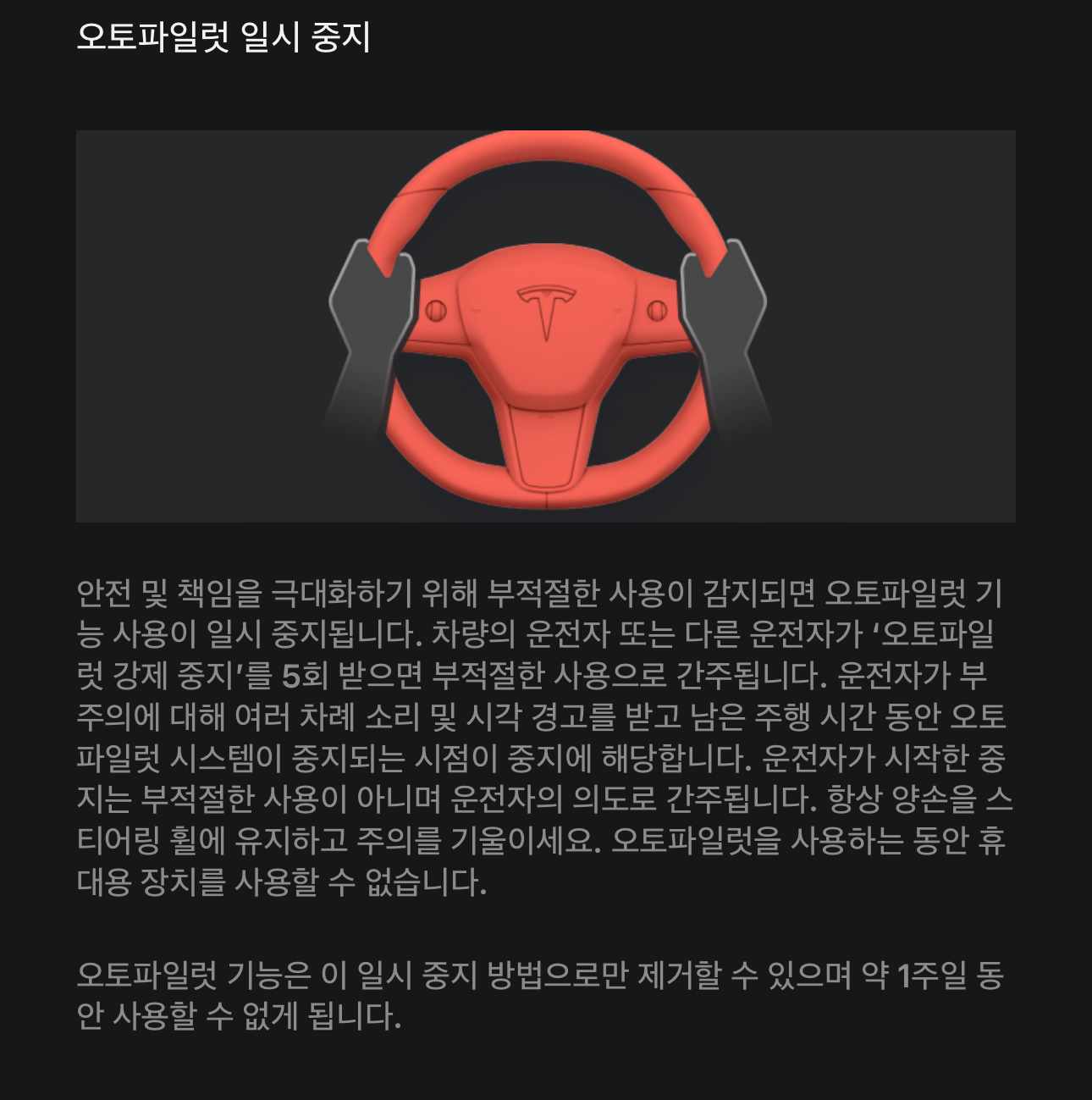 오토파일럿을 1주일 동안 사용할 수 없게 됩니다.