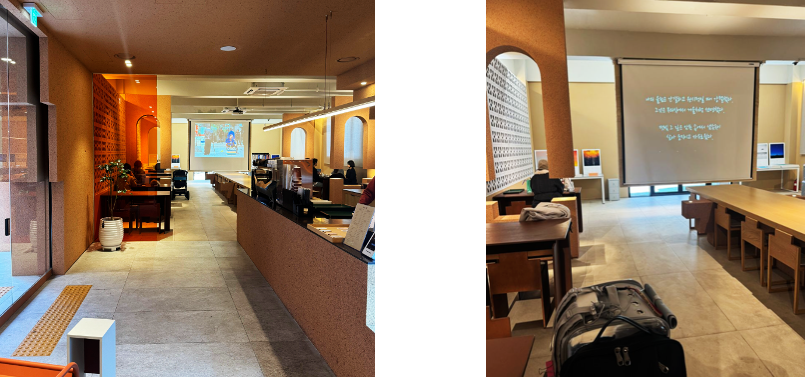 매장 입구를 지나면 오른쪽에 베이커리 진열대와 그 너머로 예약제로 운영되는 단체 회의실이 보입니다.