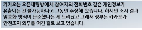 카카오 측은 판매업체가 여러 정보를 무작위로 조합한 것일 뿐, 해킹 등에 의한 개인정보 유출은 아니라는 입장이지만, 정보 보호 조치가 소홀했다는 전문가들의 지적이 나오고 있습니다.