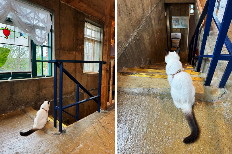1층 내려가는 계단을 바라보는 반려동물 손님.