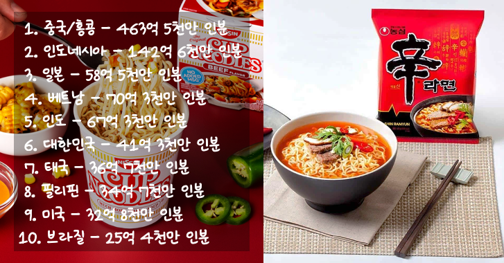 궁금하신 라면 인기 판매와 소비 순위 그리고 나라별 인기 라면 브랜드를 살펴보았습니다.