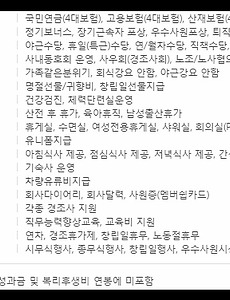 (중소기업) 복리후생제도 1. 연금보험 : 4대보험(국민연금, 고용보험, 산재보험, 건강보험), 퇴직연금, 상해보험2. 급여제도 : 정기보너스, 장기근속자 포상, 우수사원포상, 스톡옵션, 퇴직금, 인센티브제, MBO성과급, 성과인센티브제도(OPI), 목표달성성과급(TAI)제도, 초과이익분배금(PS)제도, 안식년휴가, PI(Project Incentive), PS(Profit Sharing)3. 수당제도 : 야근/특근(휴일)수당, 연/월차수당, 직책수당, 자격증수당, 장기근속수당, 가족/보육수당4. 동호회 : 사내동호회 운영 및 지원5. 명절/기념일 : 명절선물/귀향비, 생일선물/파티, 성탄절카드/선물, 결혼기념일선물6. 의료/건강 : 건강검진, 진료비지원(본인), 진료비지원(가족), 체력단련실운영, 무료..