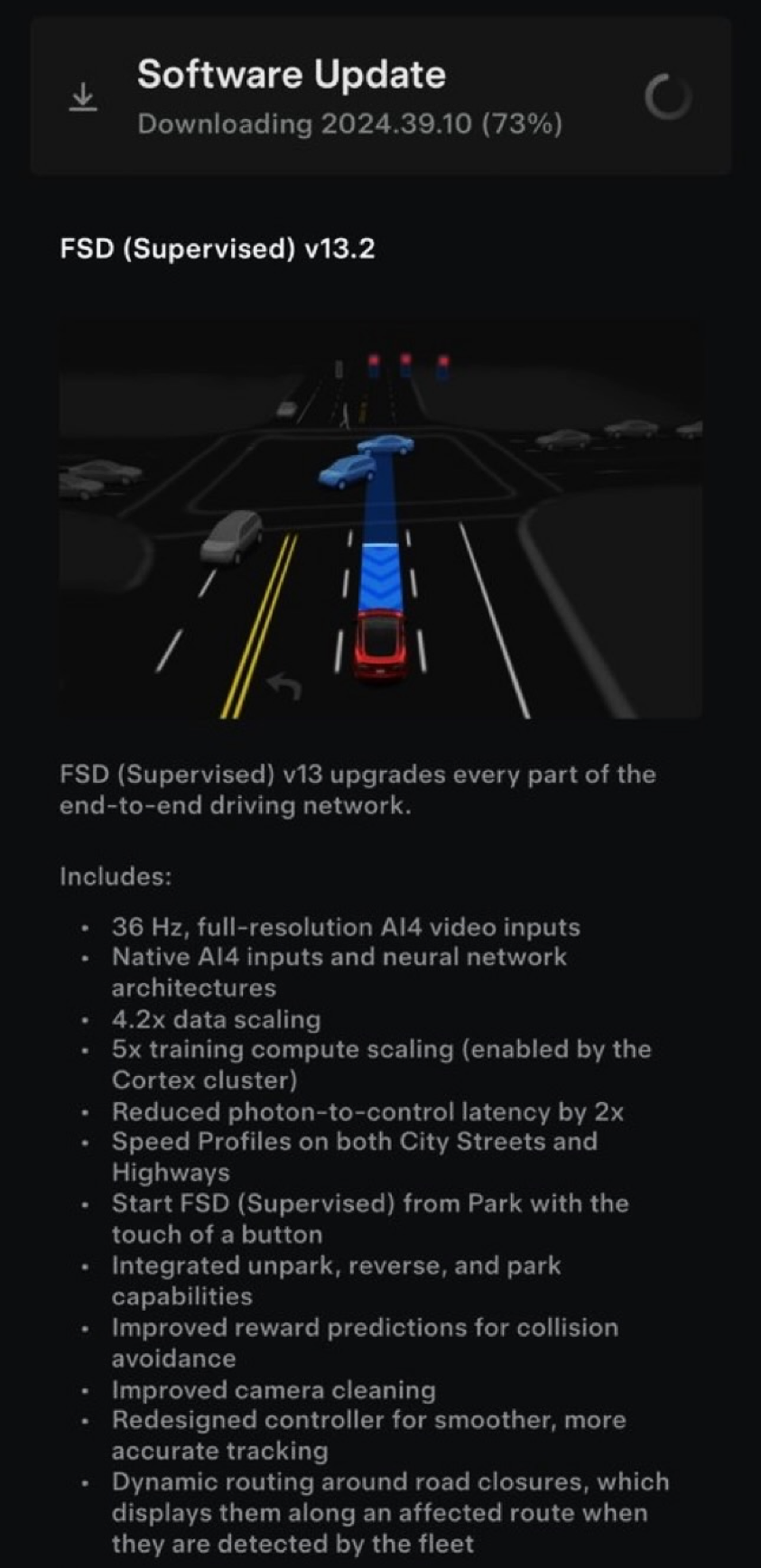 2일 테슬라의 아쇼크 엘루스와미 인공지능(AI) 소프트웨어 부사장의 엑스(X·옛 트위터)를 보면 그는 "13.2 버전의 FSD가 일부 고객에게 배포되기 시작했다"고 밝혔습니다. 이 소프트웨어는 월 99달러를 지불하는 FSD 이용 고객에게 제공될 것으로 보입니다. 기존에는 버전 12였습니다. FSD v12가 나온 지 약 1년 만으로 테슬라의 완전자율주행 개발 버전이 나온 것입니다.