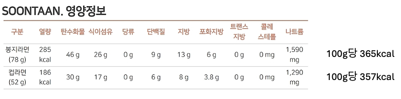 순탄라면 사리만 정보가 없기 때문에 순탄라면 얼큰한맛 1봉지와 1컵라면의 영양정보를 표시합니다.