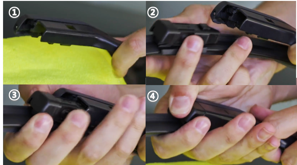⚠️ 경고 : 새 와이퍼 블레이드가 제자리에 고정되어 움직이지 않는지 확인합니다. 밀고 당기기 테스트를 수행하여 고정 여부를 확인합니다. 제자리에 고정('딸깍' 소리와 느낌이 있어야 함)되지 않은 경우, 사용 중에 와이퍼 블레이드가 분리되어 심각한 손상을 초래할 수 있습니다.