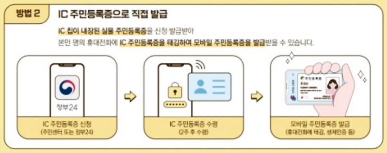 IC칩이 내장된 실물 주민등록증을 보유한 경우, 주민센터에 방문하지 않아도 됩니다. 실물 주민등록증을 휴대전화 기종에 관계없이 접촉하면 모바일 주민등록증을 발급받을 수 있습니다. (방법 2)