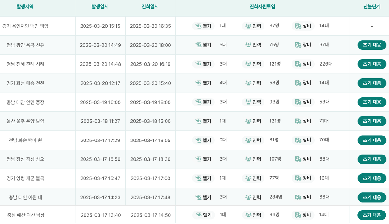 ※ 진화자원 이력은 지역산불관리기관의 산불 발생 및 피해 상황 보고가 접수·처리된 이후 제공됩니다.