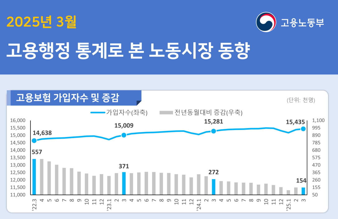 고용노동부가 발표한 '2025년 3월 고용행정 통계'에 따르면, 고용보험 상시 가입자는 1,543만 5,000명으로 전년 동월 대비 1% 증가했습니다. 얼핏 보면 나쁘지 않아 보이지만, 그 속을 들여다보면 양상이 달라집니다.