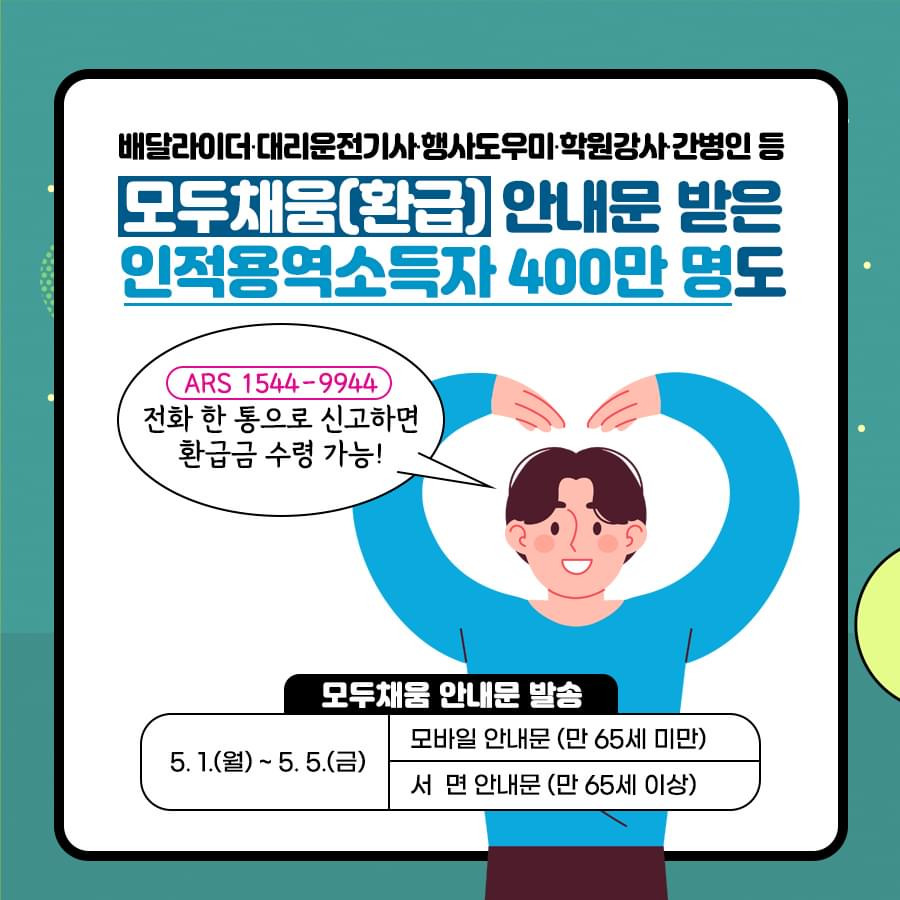 특히 종합소득세 환급금이 발생하는 443만명은 모두채움 환급 안내문을 받을 수 있습니다. 배달라이더·대리운전기사·행사도우미·학원강사·간병인 등 인적용역 소득자가 대상이며 환급 예상액 모두 1조70억원으로 추산됐습니다.