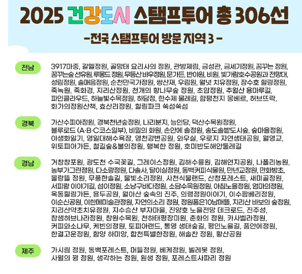 2025년 건강도시 스탬프투어는 작년보다 더욱 늘어난 전국 306개 장소에서 진행합니다.