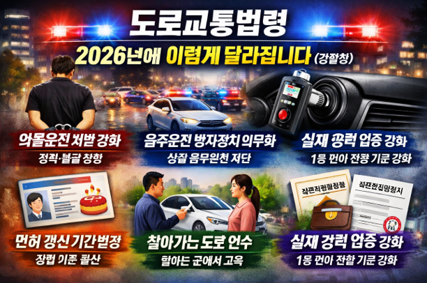 #2026도로교통법 #도로교통법개정 #약물운전처벌강화 #음주운전방지장치 #상습음주운전 #면허갱신변경 #운전면허제도 #장롱면허 #찾아가는도로연수 #경찰청정책 #교통법규 #운전자필독 #생활법령 #2026제도변화 #교통안전