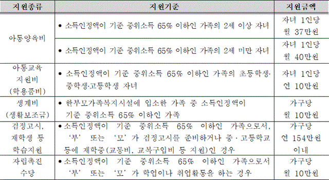 | 기본 양육비 | 월 23만 원 / 자녀 1인 (중위소득 65% 이하) | |