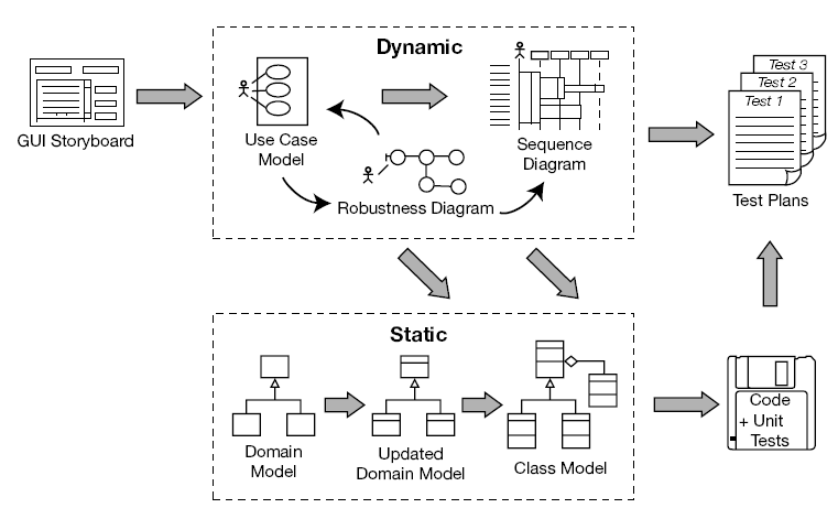 Milestone 3: Detailed/Critical Design Review The static model is the grittier, more detailed version of the domain model, and it contains more implementation details. The static model has detailed class diagrams (perhaps even reverse engineered from the source code, but not necessarily) that are at a very detailed abstraction level and match the sequence diagrams. MODELING QUESTION: SHOULD WE REUSE THE DOMAIN MODEL DIAGRAM AND SIMPLY KEEP ADDING TO IT UNTIL WE HAVE OUR STATIC MODEL? If you know that your project is going to go through only one release (or a couple of releases at most), this approach serves nicely. However, in an agile project with lots of short releases and with domain modeling activities at the start of each release, it pays to keep separate diagrams for the domain model and class diagrams. The class diagram still grows and evolves from the original domain model (this approach is fundamental to ICONIX Process), but the diagrams are kept separate. The domain model reflects our current understanding of the business domain (i.e., it’s an analysis-level artifact), whereas the fleshed-out class diagrams (there may be several) are collectively a detailed design artifact. As our understanding of the business domain evolves, we need to be able to quickly update and maybe also refactor the domain model, without getting slowed down by having to consider design details from previous iterations (at least not yet—that comes when we get to the design stage). Of course, this means that you have an extra diagram to update, but it’s a trade-off. The benefit is that it’s much easier to keep the domain model up to date, and it’s easier to read (because it’s uncluttered by design details and records of design decisions). If the domain model and the class diagram are the same diagram, it’s also more difficult to update the domain model in light of new business understanding, because you’re in effect modifying the detailed design without going through all the intermediate steps to get there (robustness analysis, sequence diagrams, and so forth). Step 6: Write/Generate the CodeThis step is, of course, where the programmers take the design and start to code from it. The programmers should have been involved in all the design steps (ideally the designers are also the programmers), so that the design has some grounding in the reality of the technologies in which the system will be implemented. This step is subdivided into the following steps: