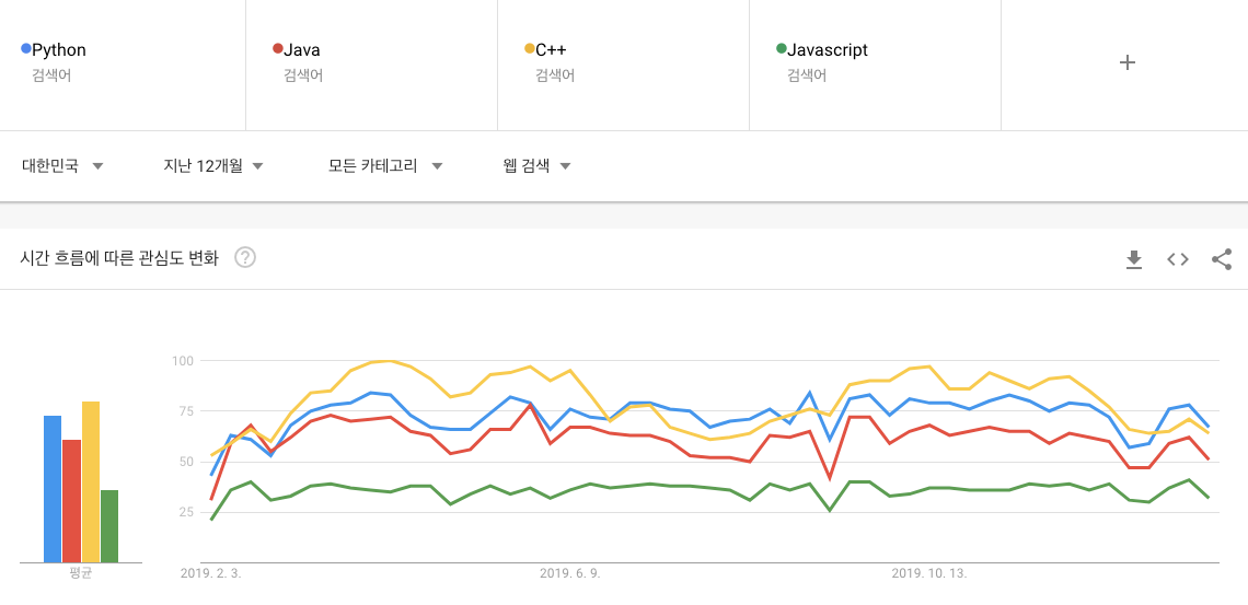 한국(South Korea)에서의 4가지 개발언어의 인기를 살펴보자.