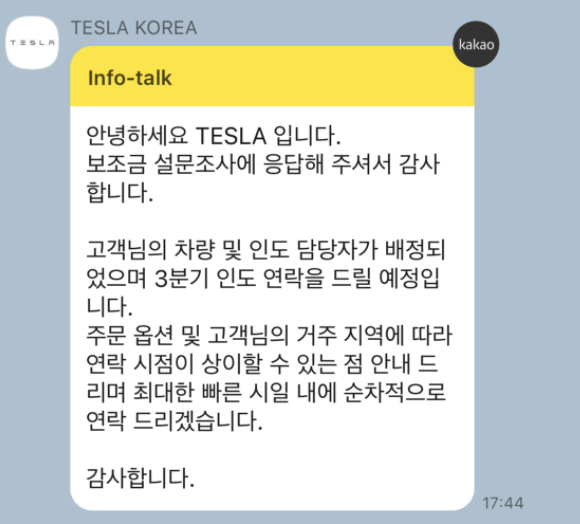 테슬라 모델Y를 구매계약하게 되면, 그 다음은 설문조사 문자를 기다려야 합니다. 즉, 인도절차의 시작이라고 보면됩니다.