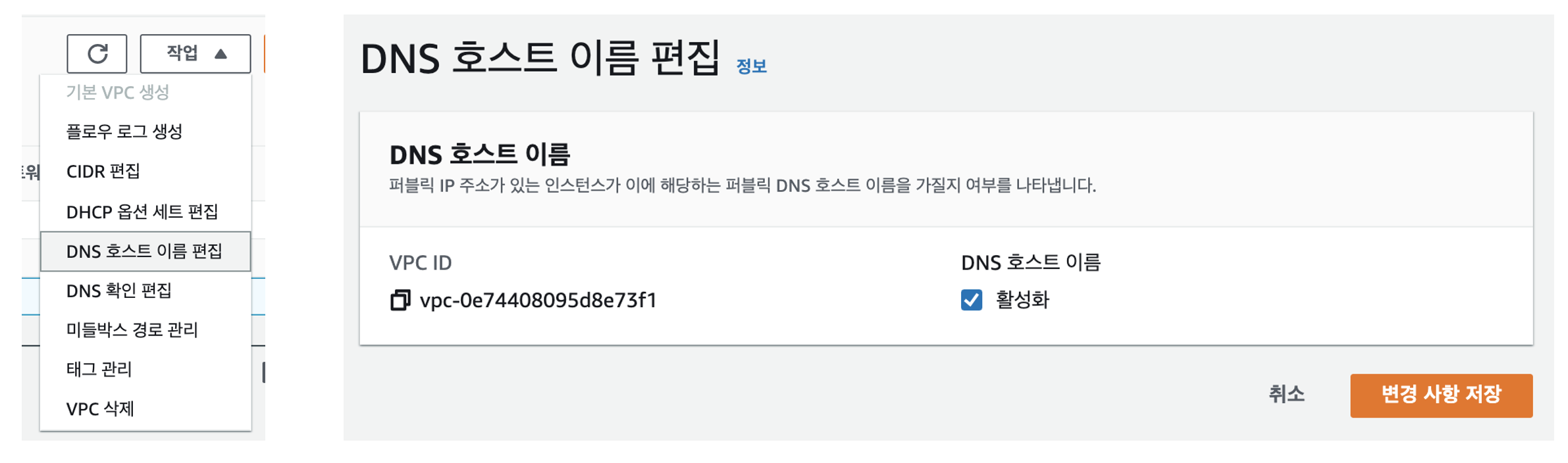 생성한 VPC행의 빈란을 클릭하고 dns호스트 이름 활성 : 체크
