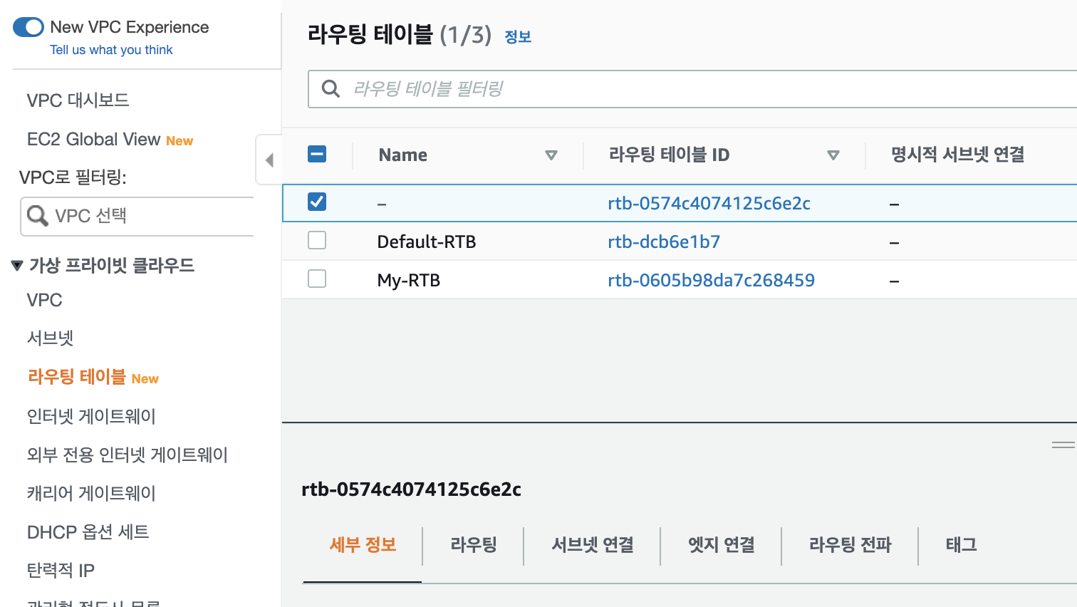 VPC에서 생성한 라우팅 테이블에 name tag "MY-RTB-01"를 입력합니다.