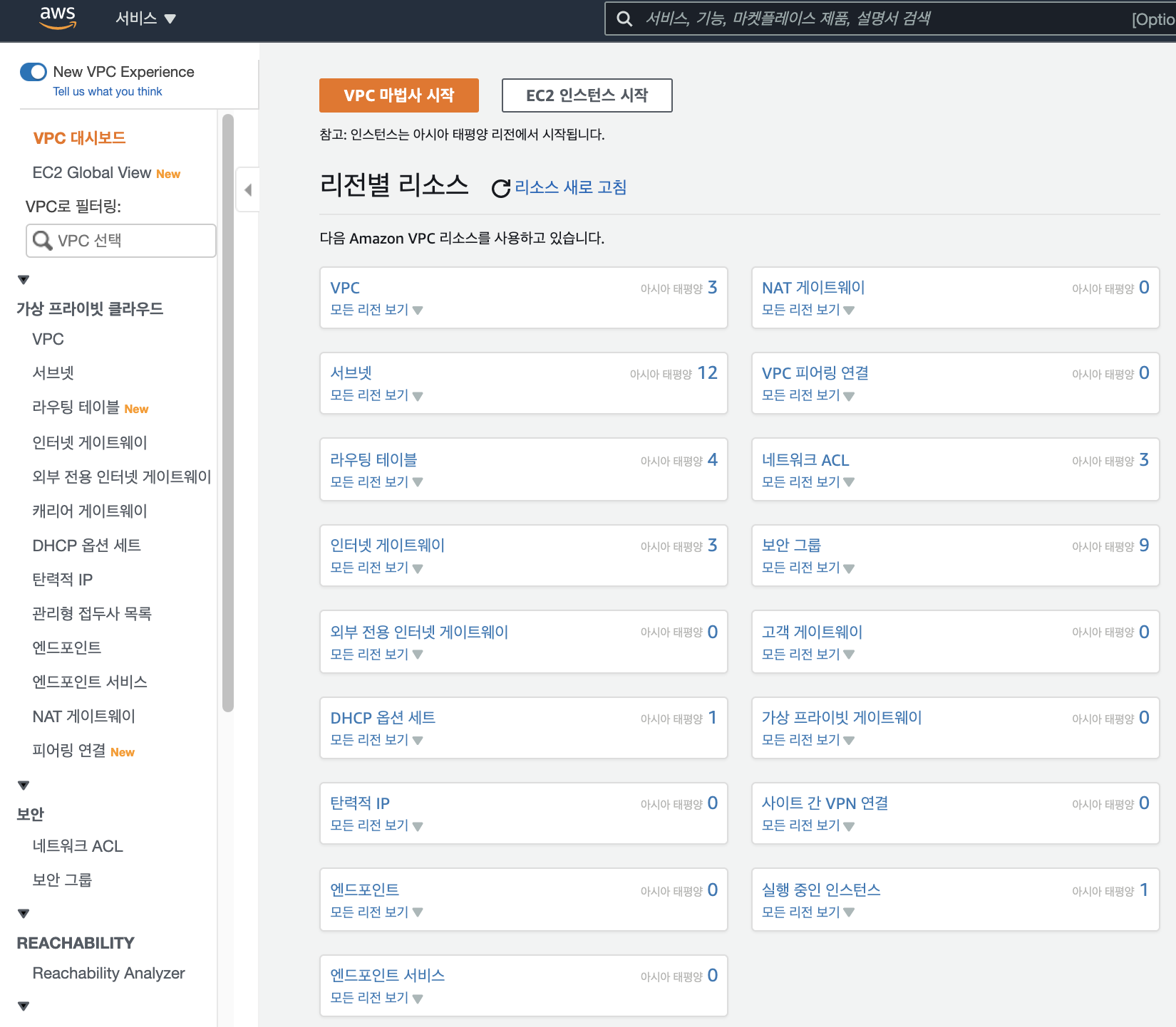 EC2 관련 리소스 현황을 한 눈에 볼 수 있습니다.