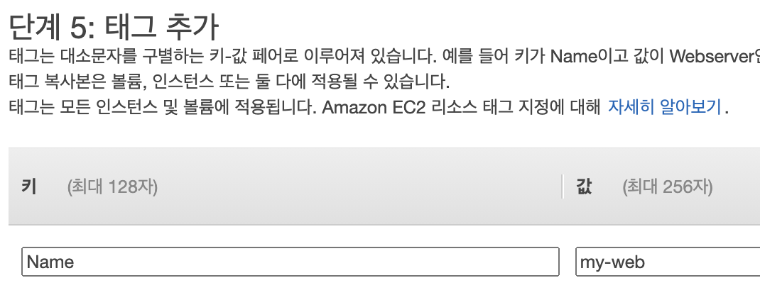 "Name 태그를 추가하려면 클릭합니다"를 클릭하여 "Name Tag"를 "my-web"으로 입력합니다.