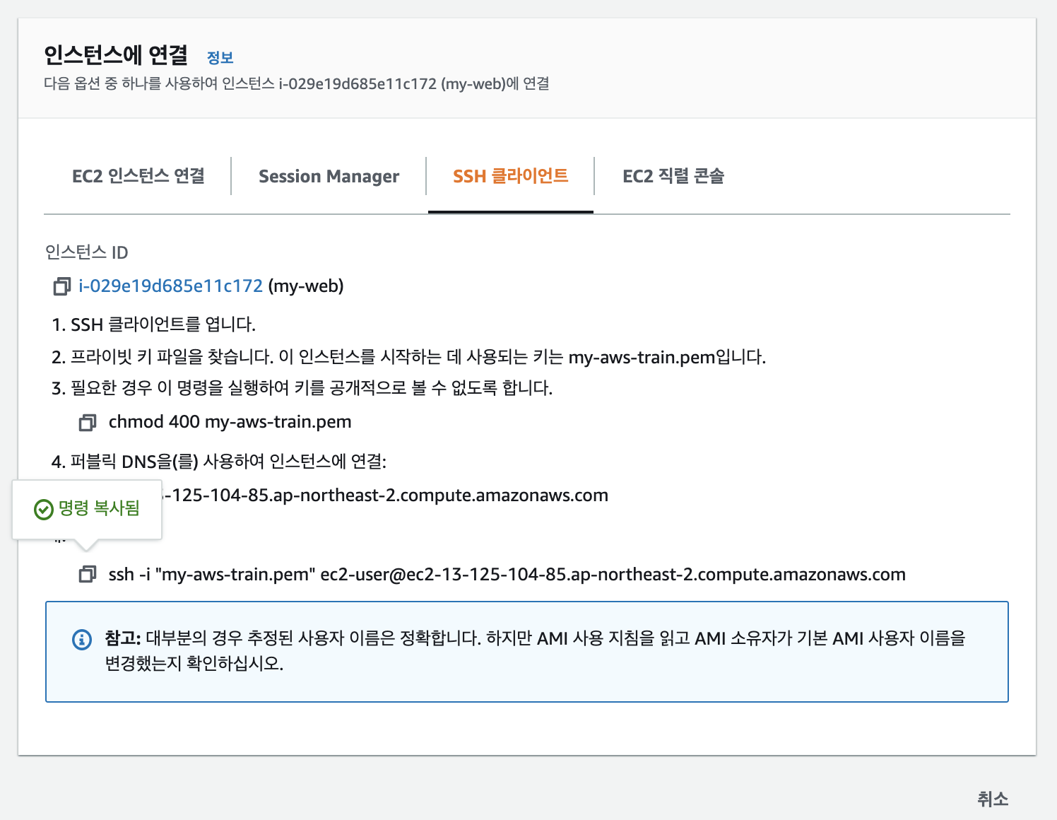 "SSH 클라이언트" 탭을 클릭하고 아래의 "퍼블릭 DNS을(를) 사용하여 인스턴스에 연결을 복사합니다.