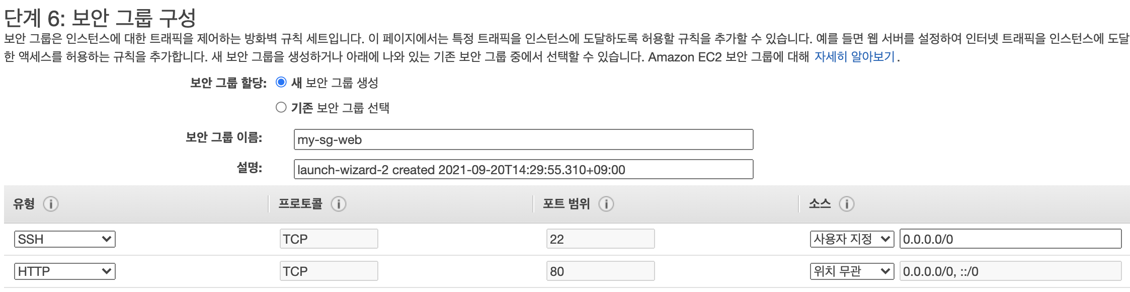 | 단계6 보안그룹 구성 | 이름 : "my-sg-web-01" 유형 추가 : http, 위치무관 |